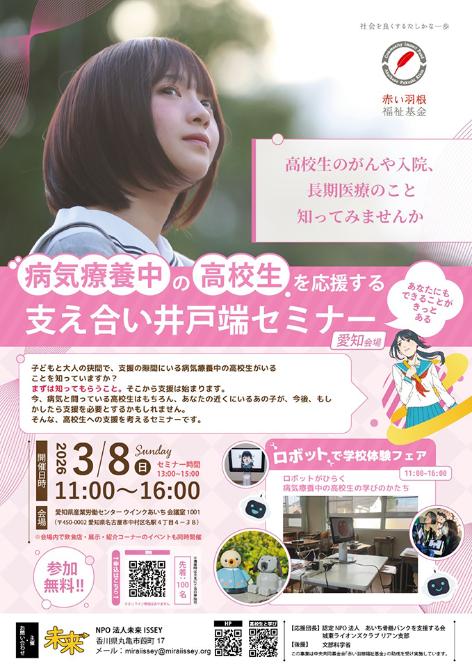3月8日(日)、ウインクあいちにて「療養中の高校生を応援する支え合い井戸端セミナー」が開催されました。同セミナーの主催は香川県の「NPO法人 未来ISSEY」、『療養中の高校生を応援する支え合い井戸端セミナー』を名古屋で開催したいので手伝ってほしいとのお声をかけていただき、当会が「応援団」としてお手伝いすることになりました。広島、福島、高松、名古屋でセミナーを開催、名古屋が20225年度の最終開催地でした。