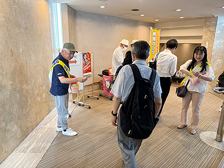 会場入口で、大会に来られた皆様にギフトオブライフとキティちゃんのティッシュペーパーを配りました。献血に対して熱心な、社会貢献に対しても意識の高い方々が集まっていらっしゃるだけあって、皆様が気持ちよく笑顔で受け取ってくださいました。骨髄バンクについて、多くの方々により深くわかっていただけたように思います。また「登録しています」「提供したことがあります」などの温かいお声もかけていただきこちらが励まされました。。