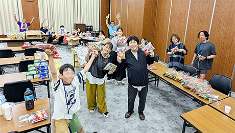 それに先立ち、その準備として7月21日(祝・月)に駄菓子屋さんで販売する駄菓子の袋詰めのお手伝いに参加しました。今年参加のボランティアはお子様たちも含め13名、リスナーボランティアさんと一緒に10種類近くのお菓子やおもちゃを袋詰めした後、ギフトオブライフとキティティッシュを同封して「金太負けるなシール」で留めて、箱詰め。当会ボランティアとリスナーボランティアさんとの連携でスムーズに行うことが出来ました。番組を終えたつボイさんと小高さんも来てくださり、同封のオモチャで手品をご披露、つボイさんや小高さんともお友達のように一緒に楽しんでいる男の子も・・・。一方、女の子たちはコツコツ黙々と作業、彼女たちをお手本に私も頑張りました。